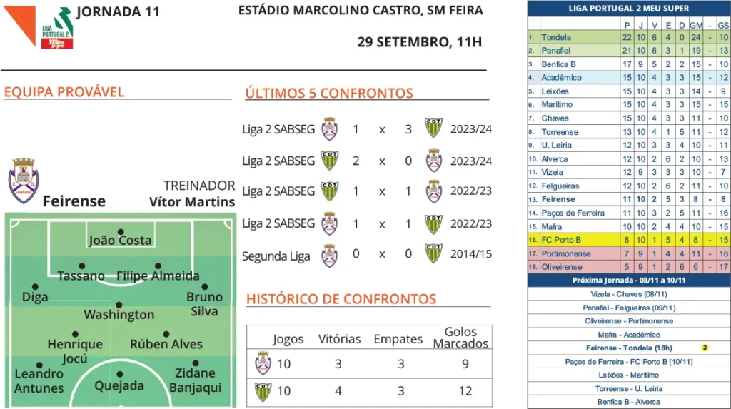 O Feirense não vence há seis jogos — cinco para o campeonato — e, em caso de derrota na receção ao Tondela, pode mesmo cair em posição de playoff de manutenção, lugar com que terminou a época transata