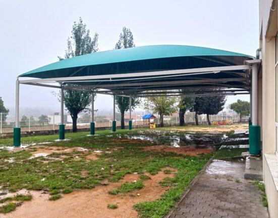 A construção de uma tenda no recreio da Escola Básica e Jardim de Infância de Santo António, em Rio Meão,