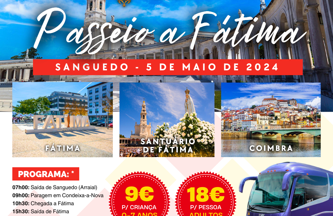 O Rancho Folclórico Santa Eulália de Sanguedo está a organizar um passeio a Fátima, no próximo dia 5 de maio, com partida e chegada no Largo do Arraial. O passeio é aberto a toda a comunidade, tendo o preço de nove euros para crianças até aos sete anos e de 18€ para adultos. As inscrições […]